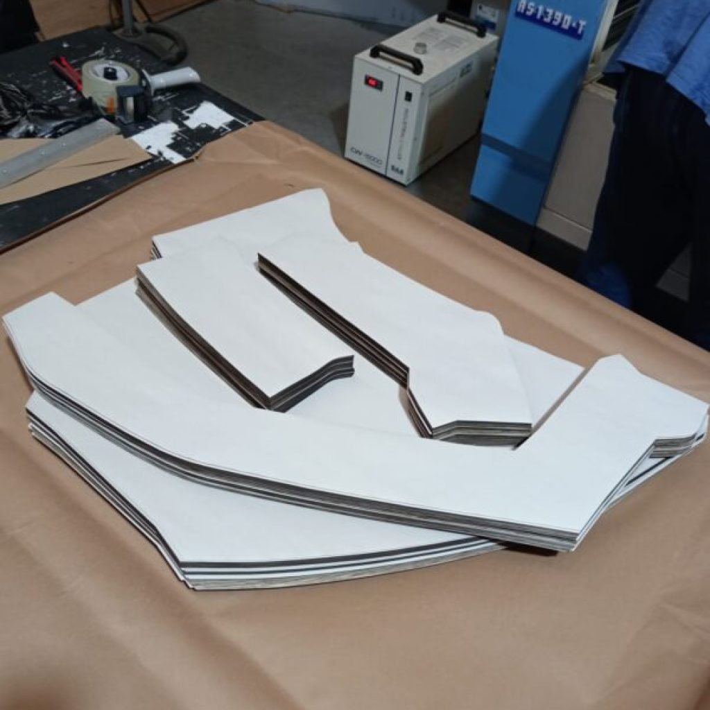 Equipo de diseñadores con equipo de corte y grabado láser